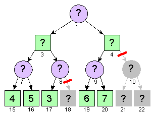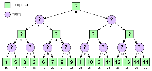 De posities zijn genummerd van boven naar beneden en van links naar rechts. Voor elke positie 15<=p<31 geldt dat de waarde van deze positie bekend is. Voor elke positie 0<=p<15 geldt dat de twee mogelijke volgende posities p*2+1 en p*2+2 zijn. Bijvoorbeeld: positie 4 heeft als mogelijke volgende posities 9 (2*4+1) en 10 (2*4+2).
