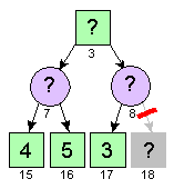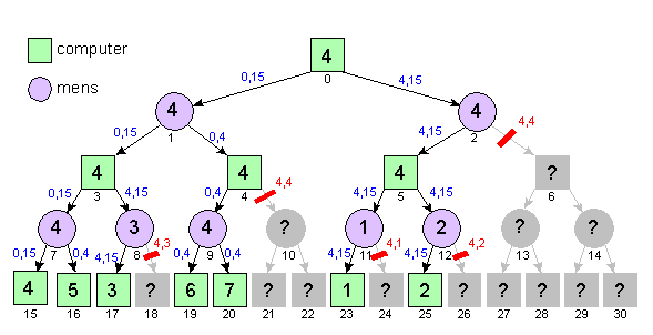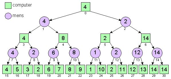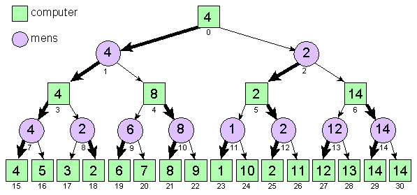 De computer moet de hoogst haalbare waarde zien te bereiken. In de figuur lijkt dit een van de twee posities met de waarde 14 maar deze zijn onbereikbaar denk maar even na. Bij zijn eerste beurt gaat de computer naar rechts (richting 14). De tegenstander (mens) zal dan echter naar links gaan. De computer zal nu bij zijn volgende beurt naar rechts gaan (richting 11) maar zijn tegenstander zal bij de volgende beurt weer voor links kiezen waardoor de bereikte positie de waarde 2 heeft (niet best voor de computer dus).