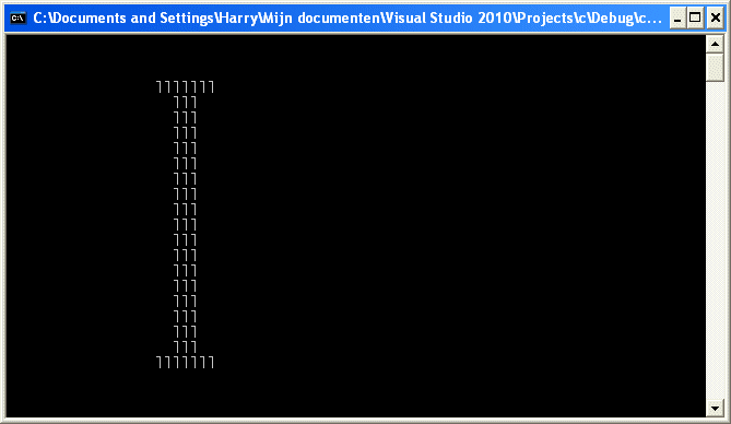 #include <stdio.h>#define HEIGHT 17#define OFFSET " " /* 17 spaties */int main(void) {int i;printf("\n\n\n%slllllll\n", OFFSET);for (i = 0; i < HEIGHT; i = i + 1) {printf("%s lll\n", OFFSET);}printf("%slllllll\n\n\n", OFFSET);getchar();return 0;}
