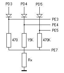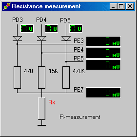 Als PD3 = 1, PD4 = 0 en PD3 = 0 dan zal alleen de diode bij PD3 geleiden. De spanning (ongeveer 5V) op PD3 zal verdeeld worden over de diode, de weerstand van 470 ohm en de weerstand Rx. Door nu de spanning op PE3 en op PE7 te meten kan de waarde van de onbekende weerstand berekend worden. Als de waarde van Rx echter veel groter is dan 470 ohm ontstaat een probleem. Als Rx bijvoorbeeld 1M is dan bedraagt het spanningsverschil tussen PE3 en PE7 slechts 3 mV. Dit kan niet gemeten worden met de 68HC11 omdat de 8 bits AD converter van de 68HC11 een nauwkeurigheid heeft van ± 20mV. Gebruiken we in dit geval echter een hogere voorschakelweerstand, bijvoorbeeld 470 K i.p.v. 470 ohm (PD3 = 0, PD4 = 0 en PD5 = 1) dan bedraagt het spanningsverschil tussen PE5 en PE7 1.4 V. De voorschakelweerstand van 470 K is echter weer niet geschikt om een weerstand van 100 ohm te meten.