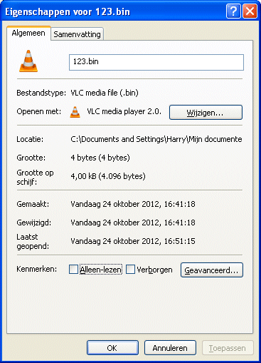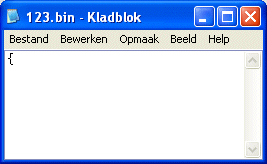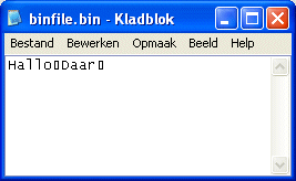In het directory waar de executable file is uitgevoerd is nu de file 123.bin aangemaakt. In de filebrowser kunnen de "eigenschappen" van deze file bekeken worden. De file blijkt 4 bytes groot te zijn. Deze file kan wel met notepad worden geopend maar je ziet dan "vreemde" karakters: