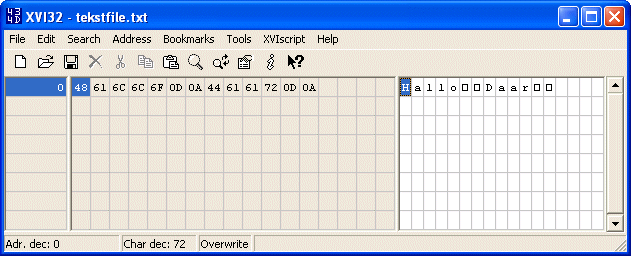 Met de hexeditor kunnen we de inhoud van de file zowel in hexadecimale codering als in ASCII codering bekijken.