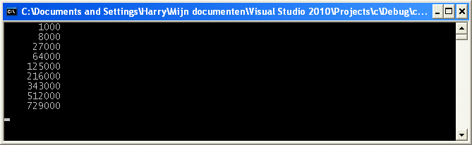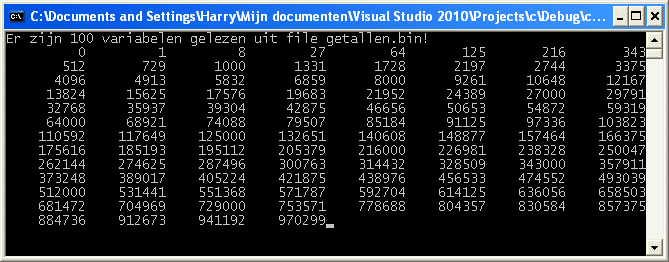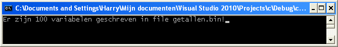 #include <stdio.h>#define AANTAL 100int main(void) {int rij[AANTAL], i;FILE *fp;size_t ret;for (i = 0; i < AANTAL; ++i) {rij[i] = i * i * i;}fp = fopen("getallen.bin", "wb");if (fp == NULL) {printf("Kan file getallen.bin niet openen!");}else {ret = fwrite(&rij[0], sizeof rij[0], AANTAL, fp);if (ret != AANTAL) {printf("Er is iets fout gegaan bij schrijven in file getallen.bin!");}else {printf("Er zijn %d variabelen geschreven in file getallen.bin!", ret);}fclose(fp);}getchar();return 0;}