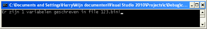 #include <stdio.h>int main(void) {int i = 123;FILE *fp;size_t ret;fp = fopen("123.bin", "wb");if (fp == NULL) {printf("Kan file 123.bin niet openen!");}else {ret = fwrite(&i, sizeof i, 1, fp);if (ret != 1) {printf("Er is iets fout gegaan bij schrijven in file 123.bin!");}else {printf("Er zijn %d variabelen geschreven in file 123.bin!", ret);}fclose(fp);}getchar();return 0;}