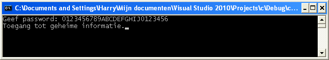 #include <stdio.h>#include <string.h>int main(void) {char password[] = "Geheim", buffer[10];printf("Geef password: ");scanf("%s", buffer);if (strncmp(password, buffer, 7) == 0) {printf("Toegang tot geheime informatie.");}else {printf("Onjuist password!");}fflush(stdin);getchar();return 0;}