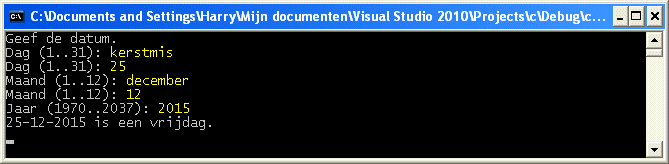 #include <stdio.h>#include <time.h>int main(void) {struct tm t, *pt;time_t tijd;char* dag[] = {"zondag", "maandag", "dinsdag", "woensdag", "donderdag", "vrijdag", "zaterdag"};/* stuct tm t vullen */printf("Geef de datum.\n");do {printf("Dag (1..31): ");fflush(stdin);}while (scanf("%d", &t.tm_mday) != 1 || t.tm_mday < 1 || t.tm_mday > 31);do {printf("Maand (1..12): ");fflush(stdin);}while (scanf("%d", &t.tm_mon) != 1 || t.tm_mon < 1 || t.tm_mon > 12);t.tm_mon -= 1;do {printf("Jaar (1970..2037): ");fflush(stdin);}while (scanf("%d", &t.tm_year) != 1 || t.tm_year < 1970 || t.tm_year > 2037);t.tm_year -= 1900;t.tm_sec = 0;t.tm_min = 0;t.tm_hour = 0;t.tm_isdst = -1;/* struct tm omzetten naar een time_t */tijd = mktime(&t);if (tijd == -1) {printf("Ongeldige datum!\n");}else {/* time_t weer terug omzetten naar een struct tm */pt = localtime(&tijd);/* De dag van de week afdrukken */printf("%02d-%02d-%4d is een %s.\n", pt->tm_mday, pt->tm_mon + 1, pt->tm_year + 1900, dag[pt->tm_wday]);}fflush(stdin);getchar();return 0;}