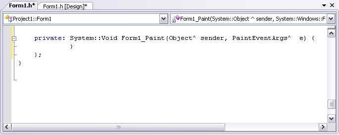 code). Het gaat om de volgende regel:this->Paint += gcnew System::Windows::Forms::PaintEventHandler(this, &Form1::Form1_Paint);