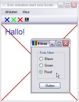 Windows kent een aantal zogenaamde "common dialogs". Dit zijn standaard in Windows beschikbare dialogs. Laten we ons programma eens uitbreiden met de standaard dialog om een kleur te kiezen.