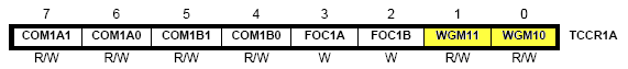 Informatie over de benodigde I/O registers van Timer/Counter1 kun je vinden in de datasheet van de ATmega16. De belangrijkste registers en tabellen zijn hieronder weergegeven: