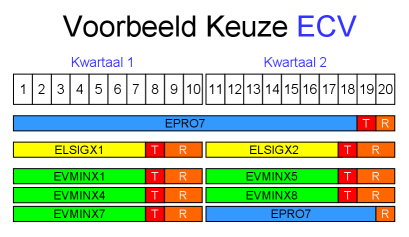 Het semester ECV omvat 20 weken die zijn verdeeld in twee blokken van 10 weken (kwartalen). De laatste twee weken van elk kwartaal zijn bestemd voor reparatiewerkzaamheden (herkansingen). Deze reparatiewerkzaamheden kunnen bestaan uit een hertoets maar ook uit een aanvullende opdracht. In week 1 t/m 18 werk je aan het EPRO7-project. In week 19 is het projectassessment. Een eventueel herassessment zal in week 20 worden afgenomen. De organisatie van ECV is hieronder weergegeven.