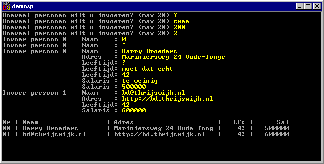 #include <stdio.h>int main() {int aantal=0;int teller;struct {char naam[21];char adres[26];int leeftijd;int salaris;} rij[20];/* Invoer */do {printf("Hoeveel personen wilt u invoeren? (max 20) ");fflush(stdin);}while (scanf("%d", &aantal)!=1 || aantal<1 || aantal>20);for (teller=0; teller<aantal; ++teller){do {printf("Invoer persoon %d Naam : ", teller);fflush(stdin);} while (scanf("%20[A-Za-z.@+()\- ]", rij[teller].naam)!=1);do {printf(" Adres : ");fflush(stdin);} while (scanf("%25[A-Za-z0-9.,?:/()\- ]", rij[teller].adres)!=1);do {printf(" Leeftijd: ");fflush(stdin);} while (scanf("%d", &rij[teller].leeftijd)!=1);do {printf(" Salaris : ");fflush(stdin);} while (scanf("%d", &rij[teller].salaris)!=1);}/* Uitvoer */printf("\n");printf("%2s | %-20s | %-25s | %5s | %8s\n", "Nr", "Naam", "Adres", "Lft", "Sal");for (teller=0; teller<aantal; ++teller) {printf("%02d | %-20s | %-25s | %5d | %8d\n",teller,rij[teller].naam,rij[teller].adres,rij[teller].leeftijd,rij[teller].salaris);}fflush(stdin);getchar();return 0;}